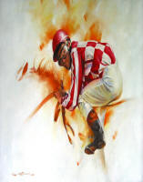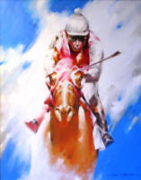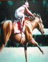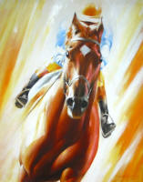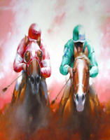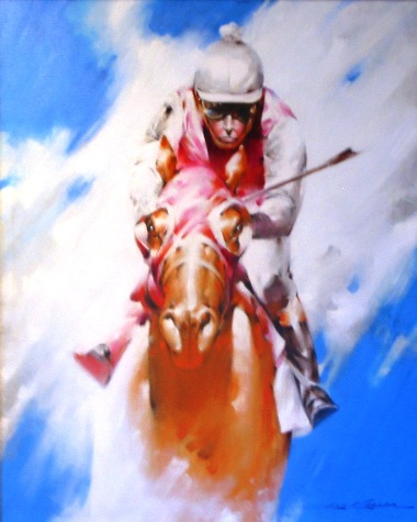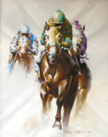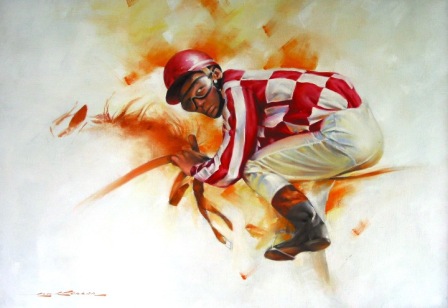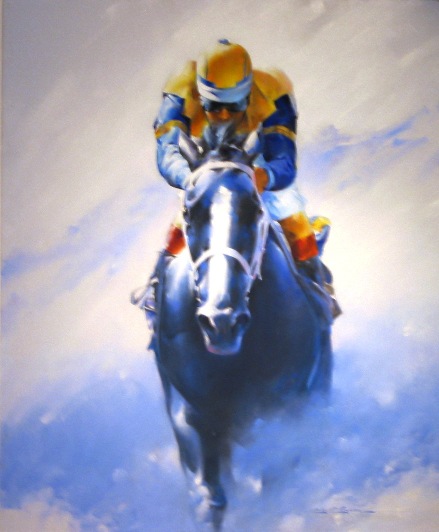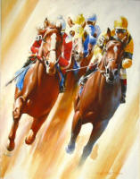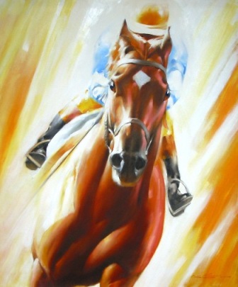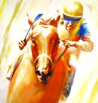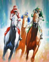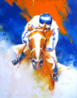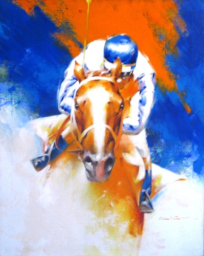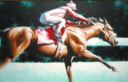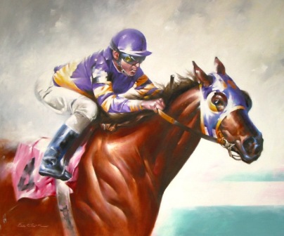 action of the racehorse with the vivid colors of the jockey silks were the